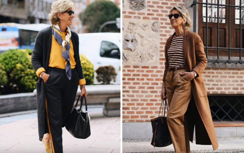 Деловая леди или дерзкая красотка, да-да, речь о женщинах в солидном возрасте. Удлиненный пиджак для важных встреч, укороченные штаны и небольшой каблук. На прогулку можно и косуху надеть со свободными брюками в клетку и выглядеть безупречно.