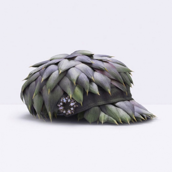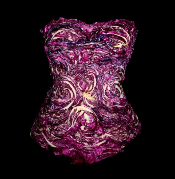 Она использовала редис и соцветия лотоса, сельдерей и бананы, лук-порей и томаты… Эта коллекция бросает вызов смыслу, функциональности и значению одежды в нашей повседневной жизни.