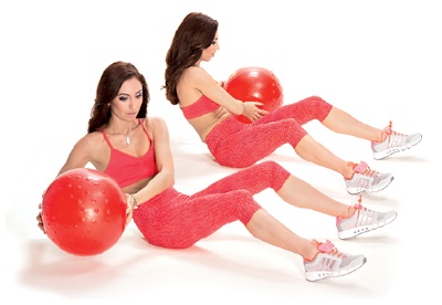 Ноги слегка сгибаем в коленях, пятки держим на полу. Немного отклоняемся назад, при этом держим спину ровной. Берем в руки мяч и выполняем круговые движения. Мяч опускаем до уровня бедер. Повторять желательно по 10 раз в каждую сторону.