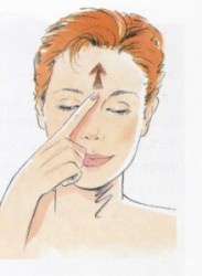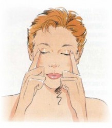 2) Уберите средние пальцы с внутренних уголков лаз. Указательные пальцы оставьте на месте. Закройте глаза, плотно сжав веки. Считайте до 20, вы почувствуете легкую вибрацию на внешних уголках глаз. Расслабьтесь. Повторите упражнение 3 раза.