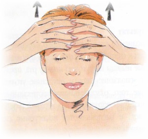 1) Поместите по четыре пальца каждой руки на лоб, таким образом, как будто вы хотите растянуть кожу. Приподнимите брови высоко вверх. Расслабьтесь. Повторите упражнение 10 раз.