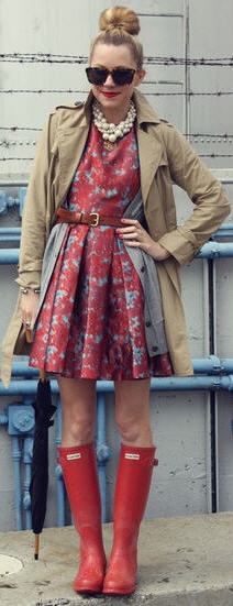 Красные резиновые сапоги лучше сочетать с красным платьем или черным платьем дополняемым под цвет сапог шарфиком. Джинсы, шорты, пышные юбки отлично смотрятся в ансамбле с сапогами.
