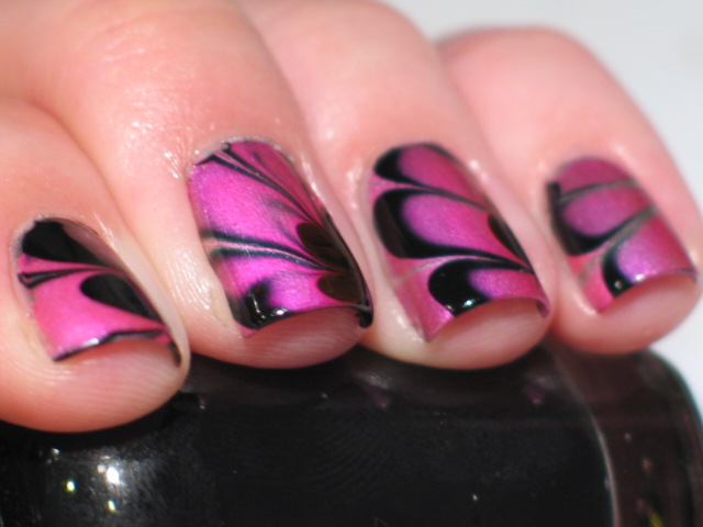Следующим пунктом в создании маникюра с помощью воды станет смешивание лаков. Подбираем цвет, доминирующий в вашей будущей композиции, затем капаем несколько капель данного лака в воду. Когда он слегка растекся, на ту же основу добавляем каплю следующего лака и так далее. Затем берем зубочистку и начинаем моделировать наш будущий узор. После этого уверенно окунаем наш ноготь в место смешивания красок, недолго держим и вытаскиваем. С помощью салфетки убираем лак с кожи, затем закрепляем маникюр бесцветным лаком. Данную процедуру теперь нужно проделать со всеми пальцами.