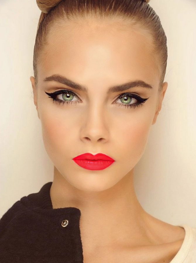 Носить стрелки с алой помадой и при этом не напоминать Диту фон Тиз (при всём её очаровании, каждый день быть в ретро-образе утомительно) вполне возможно. Вопрос не в том, что нужно для этого сделать, а в том, чего делать не надо. Так вот, не следует придавать коже фарфоровый оттенок, чернить брови, использовать яркие румяна и накладные ресницы, а также обводить губы карандашом. Когда остаётся лишь помада, деликатные стрелки и капля персиковых румян, образ можно считать минималистичным и современным.