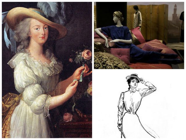 Слева – Мария-Антуанетта в платье-шемиз, справа вверху – модель от Пуаре, справа внизу – девушка Гибсона (собирательный образ американской красавицы конца 19 века).