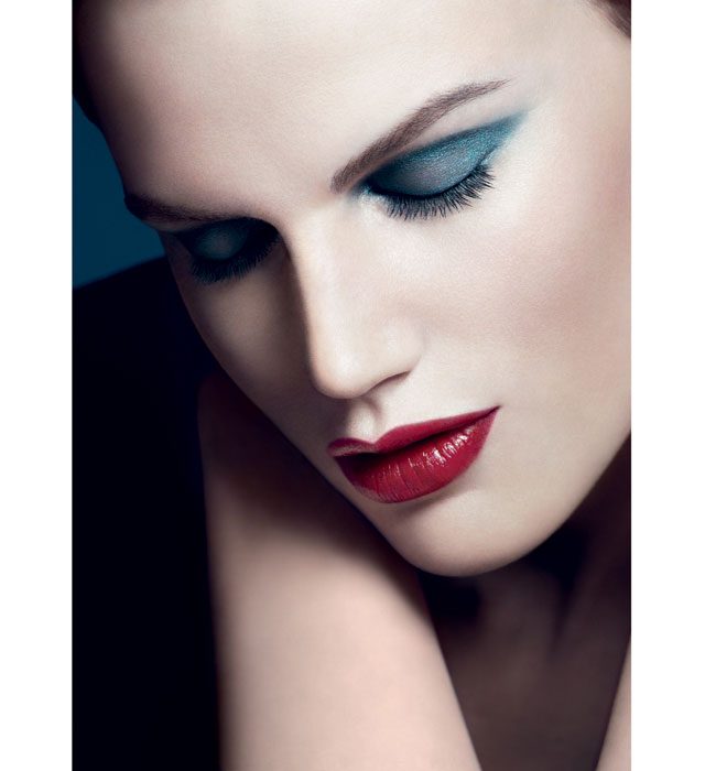 Чтобы «скульптурировать» верхнее веко, на голубые тени нужно нанести ещё один, более тёмный тон – насыщенно-сиреневый или синий. Завершит макияж помада алого, обязательного холодного оттенка. Добиться идеального контура поможет специальная кисть для контура губ. А для глянца можно добавить немного блеска.