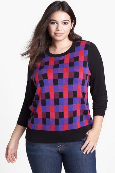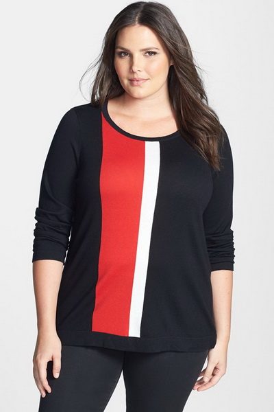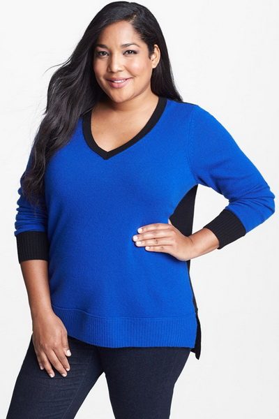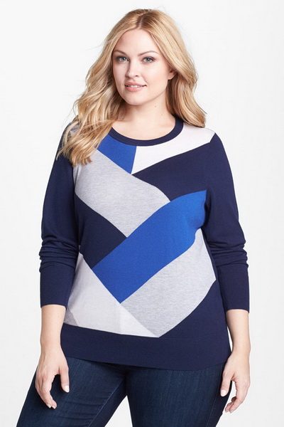 Свитера для полных могут быть самых разных расцветок – от ярких насыщенных цветов, до приглушенных пастельных и темных. В тренде – вещи в стиле колорблок, выполненные из трикотажа разных цветов, контрастирующих друг с другом. С помощью такой игры цвета можно зрительно скорректировать фигуру, располагая более темные участки в проблемных местах.