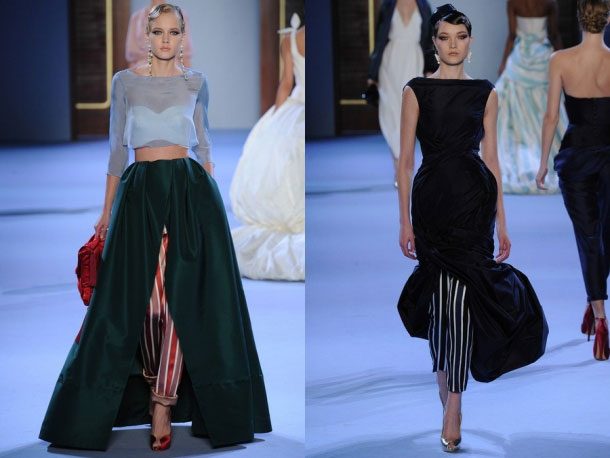 Примеры неоднозначного сочетания брюк и платья были замечены на нескольких показах Недели моды pret-a-porte. И даже в кутюрной коллекции Ульяны Сергеенко нашлось место смелому тренду.