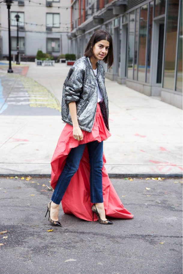 Популярный блогер Леандра Медин тоже не из робкого десятка. Она была замечена street-style фотографом на одной из улиц Нью-Йорка перед показом в рамках Недели моды. Внимание фотографа привлёк её нестандартный подход к собственному модному образу — монохромный низ состоял из прозрачной юбки поверх скинни-джинсов и был дополнен ярким акцентом в виде тёплого синего джемпера свободного кроя.