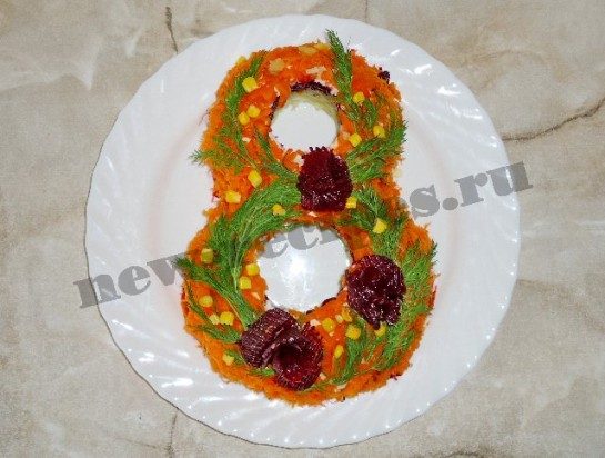 Украшаем восьмерку укропчиком и кукурузой, задача которых – изображать веточки мимозы. Очень похоже! Можно еще постараться и сделать розочки из бурячка.