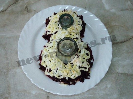 «Изюминка» салата и нюанс приготовления заключается в том, что ингредиенты нужно не просто выкладывать на блюдо, как обычно, а насыпать вокруг двух стаканчиков, побольше и поменьше размером, придавая салату форму восьмерки.