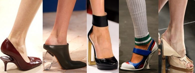 Остаются в моде прозрачные пластиковые или частично прозрачные каблуки, платформа, танкетка и необычные дизайнерские решения.