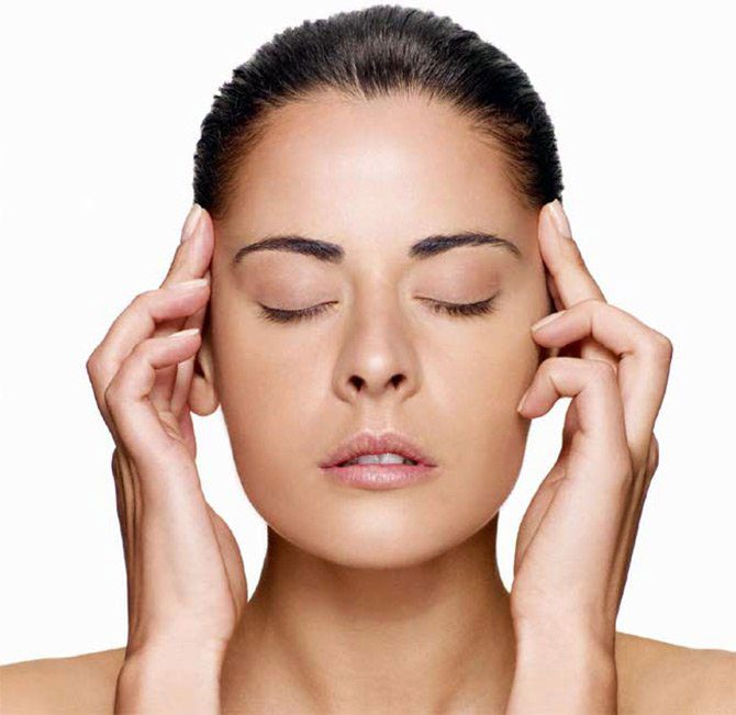 2. Коррекция опущенных бровей: указательные пальцы зафиксируйте на надбровными дугами, поднимите брови и задержите дыхание на 10 секунд. Повторите 5 раз.