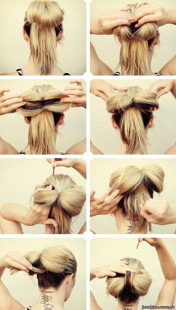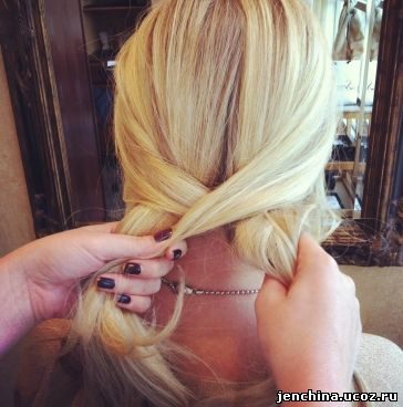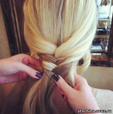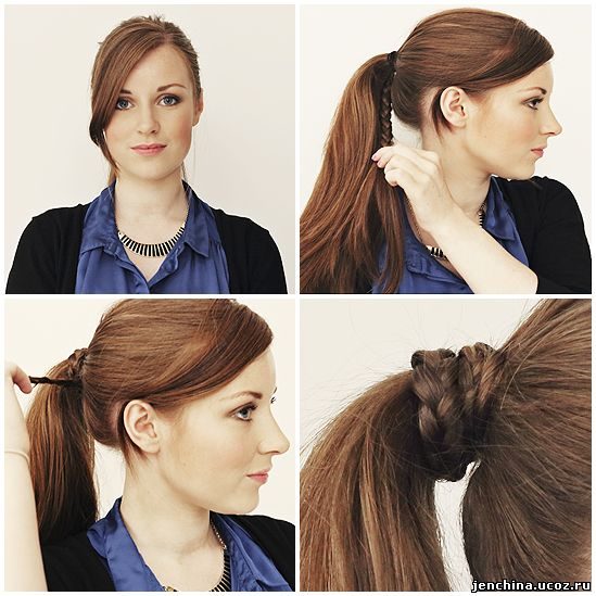 Собираем волосы в хвост и слегка резинку оттягиваем назад, чтобы хвост стал свободным. Затем разъединяем волосы до резинки на две части, чтобы получилось отверстие. В это отверстие нужно просунуть хвост, а затем закрутить его в жгут. Полученный жгут нужно обкрутить вокруг основания хвоста и заколоть шпильками.