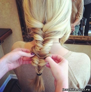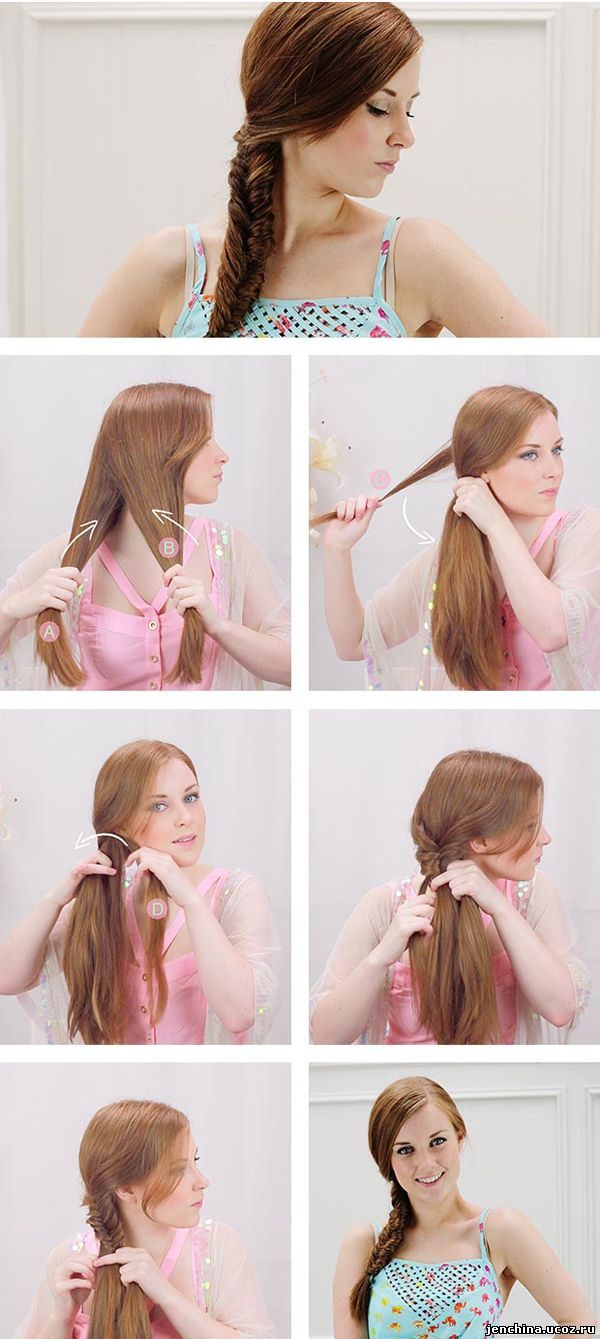 Прическа коса — рыбий хвост. Модная вот уже несколько сезонов прическа коса, делается просто. Волосы просто нужно разделить на две части и чтобы получить стильную косичку, по очереди, то с одной части волос, то с другой берется маленькая прядь и переноситься в противоположную часть волос.
