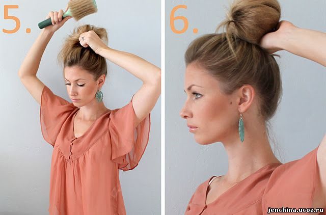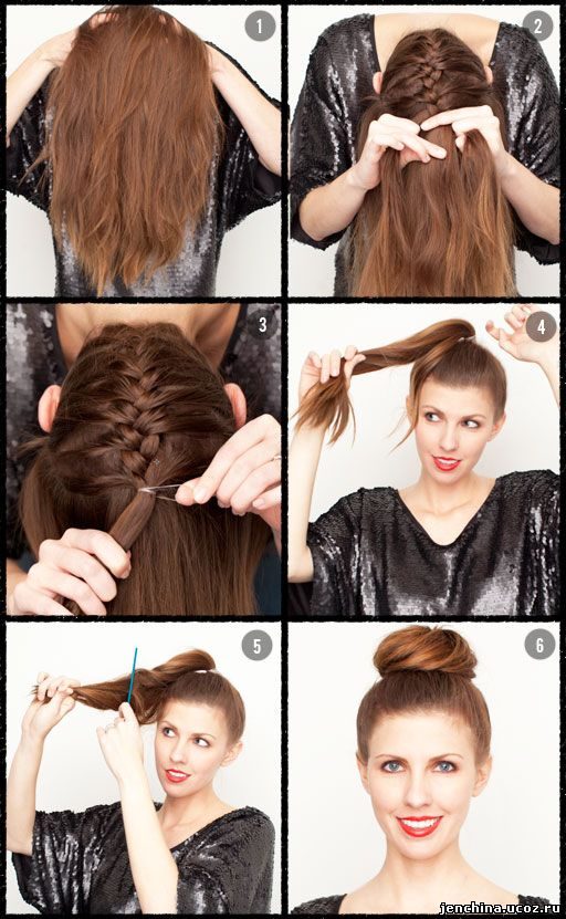 Интересная прическа, это вроде бы и пучок, но при этом она содержит в себе и плетения. Сначала нужно наклонить голову, зачесать волосы вперед и заплести колосок до макушки. После этого волосы собрать в высокий хвост и из хвоста сделать пучок.
