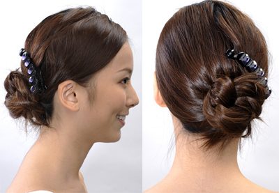 Такой простой пучок можно сделать если завязать волосы в хвост с помощью тонкой резинки, при этом оставив одну прядь с низу. Затем хвост сверните в пучок и заколите шпилькой. Оставшуюся прядь оберните вокруг пучка и заколите шпильками. С помощью спицы или другого тонкого предмета приподымите из пучка несколько прядей.