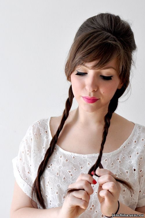Такую модную прическу можно сделать из простой косички, только плести ее нужна на бок. Возьмите у левого виска 3 пряди, начните плести косичку и постепенно захватывая пряди с верху и снизу доплетите косу до другого уха. Закрепите волосы заколкой.