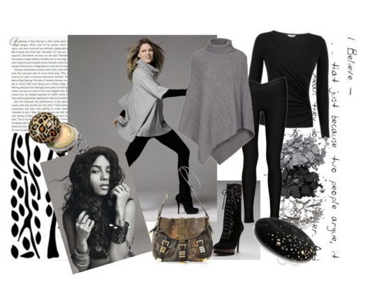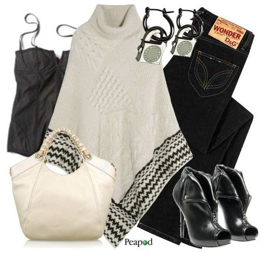Пончо превосходно сочитается с теплыми леггинсами, ботфортами.