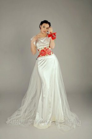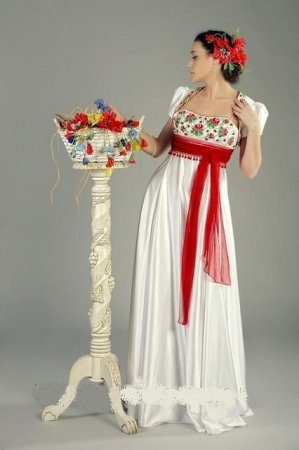 Мода на русское платье коснулась и свадебных нарядов. И следует отметить, что это выражается в буйстве контрастных сочетаний белого и ярких цветов, а также богатой, даже роскошной отделке. Наиболее часто можно встретить сочетание белого и красного. А это, как известно, придает образу торжественности и в то же время яркости и энергичности.