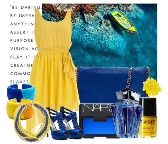 Контрастное сочетание синего и желтого, в котором они дополняют друг друга, могут себе позволить смелые и уверенные в себе девушки. Такой комплект будет выглядеть не просто оригинально, но и стильно и дерзко, что особенно модно в новом весенне-летнем сезоне. Для повседневной носки вы можете использовать сочетание светло-желтого оттенки с голубыми или светло-синими тонами. Хороший пример – сочетание желтых вещей с джинсовыми.