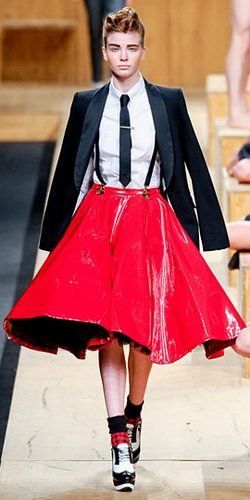 Только не рекомендуется выбирать плотную ткань для пошива короткой модной красной юбки. Не помешает украсить юбку оборками и рюшами. Для создания романтичного и нежного образа нужно подобрать соответственный легкий верх к красной мини-юбке. Разбавить консерватизм классического фасона юбки, добавить дерзновенности и игривости можно при помощи необычного топа или маечки.