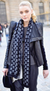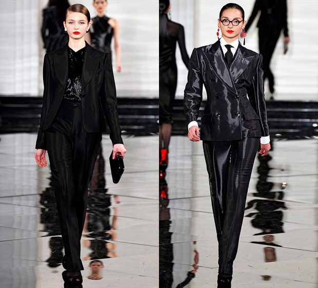 — длинный шарф, бусы, галстук, удлиненный лацкан у жакета