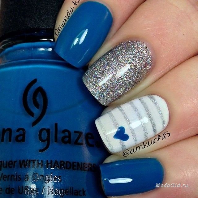 Морская тематика входит в летнюю моду каждый год, причем захватывает на этот раз и сферу маникюра. если у вас в шкафу уже висит пара тельняшек, то почему бы не «одеть» ваши ногти в тельняшку тоже? Белая и синяя полоска, изображение якорей на ногтях (или кольцо в виде якоря) — и ваш летний морской маникюр готов. Хотя морская тематика в летнем маникюре 2014 этим не ограничивается. Стилизованные волны, маникюр в оттенках синего, ракушки на ногтях — все это отлично подойдет для лета.