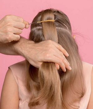 14. Выделяем вторую прядь и в той же технике начинаем укладывать ее максимально близко к первой пряди.