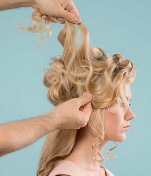 14. Все волосы сверху необходимо накрутить крупными щипцами по направлению назад.