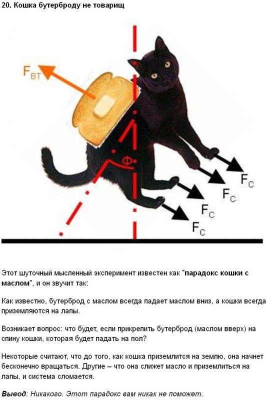Если масса бутерброда будет значительно больше массы кошки а падать они будут на очень дорогой ковер, велика вероятность приземления кошкой вверх. Вывод — всегда можно усложнить ситуацию настолько, что выпадет самый скверный вариант.