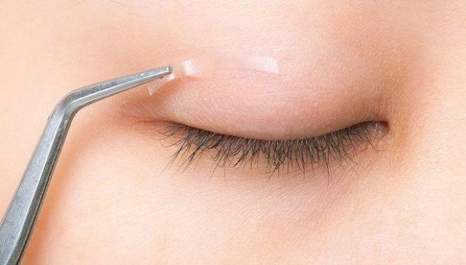 Для этого используется не только пластырь. Применяют еще клей, а к нему — обязательно цветные линзы, накладные ресницы. В ютубе видео нескольких передач, корейских, что ли, смешных… Там в виде конкурса у них всё — две девчонки без макияжа красят по пол лица, потом, их сравнивают, это вызывает поросячий восторг у публики.А в конце — фотосессия и выбор победительницы.