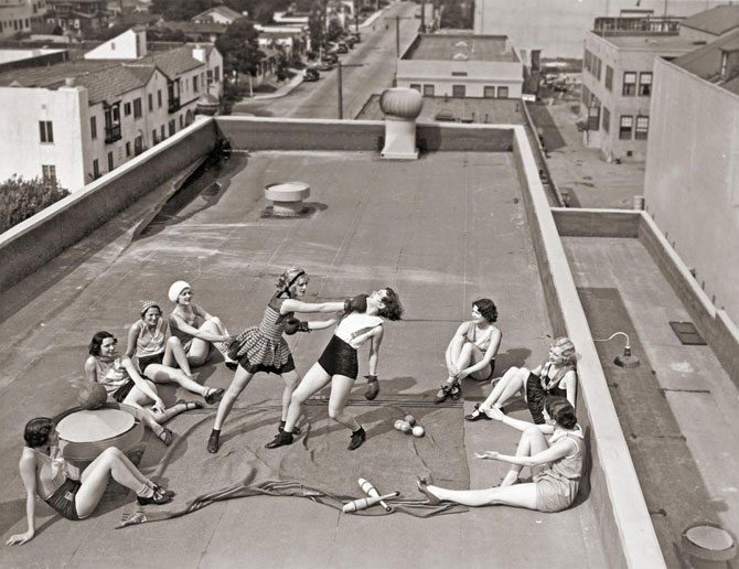 Женщины занимаются боксом на крыше в Лос-Анджелесе. 1933 год.