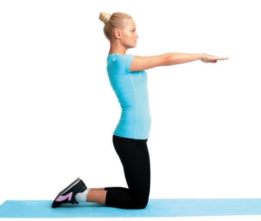 Исходное положение: стоя на коленях, руки вытянуты перед собой ладонями вниз на уровне плеч. Сохраняя прямое положение туловища, медленно отклонитесь на зад как можно дальше, задержитесь в таком положении на несколько секунд и вернитесь в исходное положение. При этом вы должны почувствовать сильное напряже ние в четырехглавой мышце бедра. Повторите упражне ние 10 раз.
