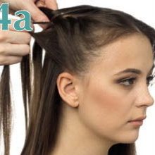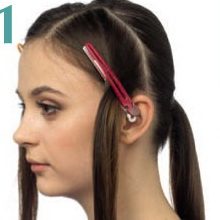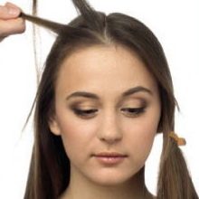 1. Разделите волосы на две равные части вертикальным пробором. Выделите часть волос у линии лба и разделите ее на две небольшие пряди.