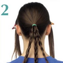 2. Разделите волосы на четыре равные части. Заплетите из них простые косы из трех прядей, закрепите маленькими резинками. Вытяните пряди по краям для большего объема.