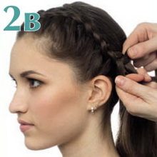 2. Заплетите из волос теменной и височно-боковых зон обратные французские косички от центрального пробора вдоль контурной линии лба, подхватывая дополнительные пряди только с внешней стороны.