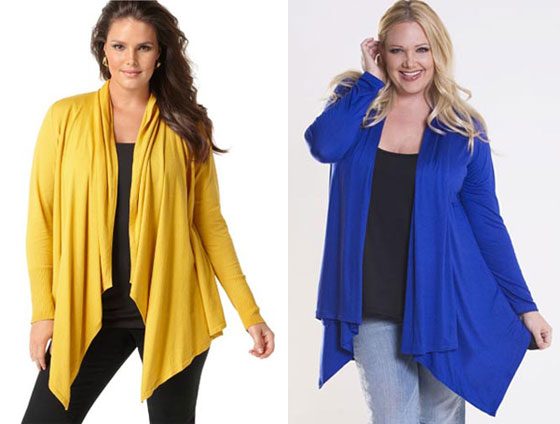• Кардиганы для полных с асимметрической длиной станут настоящей находкой. Чтобы отвлечь внимание от груди и живота выбирайте кардиган с удлиненными краями, такой силуэт сделает Вашу фигуру стройнее. А скошенные вперед полы кардигана сделают Вас визуально выше.
