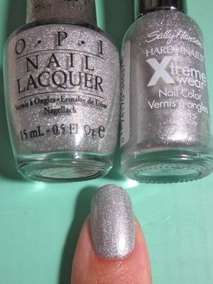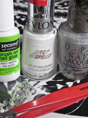 Для создания дизайна «Крестики-нолики» понадобятся серый и прозрачный лак для ногтей, серебряный блеск для ногтей, косметический карандаш для ногтей черного цвета.