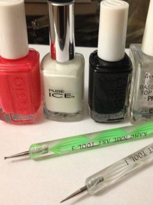 1. Нанести черный лак на четыре ногтя одной кисти и один ноготь второй кисти