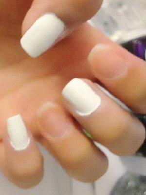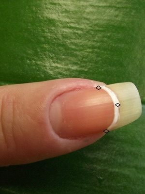 3. Белым лаком нарисовать дугообразную линию, совпадающую с линией улыбки, закрасить всю свободную поверхность ногтя. На искусственных ногтях необходимо следить, чтобы их край также был закрашен. Дождаться полного высыхания обоих лаков, потом перейти к следующему этапу.