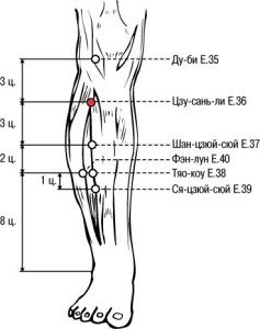 Эта точка — Цзу-сан-ли! С китайского «Цзу» переводится, как нога, «сань» — значит три, «ли» — селение, расположенное на проезжих путях. Так как китайская медицина включает знания об энергетических меридианах, то эти каналы и можно сравнить с дорогами, точки — с селениями, расположенными вдоль дорог. Поэтому точка Цзу-сань-ли — это селение, расположенное на ноге на три цуня ниже колена.