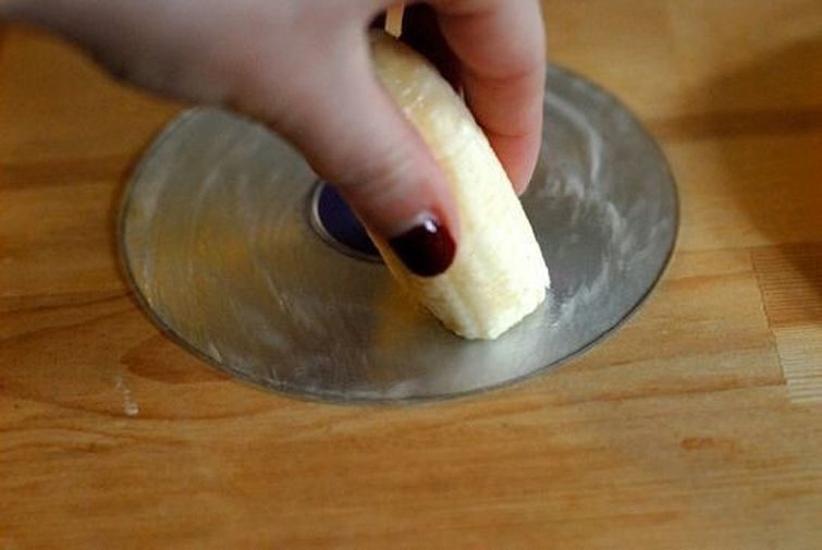 Поместите диск, имеющий мелкие царапины, на ровную поверхность этикеткой вниз. Протрите блестящую поверхность диска сначала съедобной частью банана, затем в течение 2 минут банановой кожурой. Мякоть и воск из кожуры помогут очистить и отполировать диск. Уберите остатки банана чистой мягкой тканью, смоченной в средстве для очистки стекол, и дайте диску высохнуть.