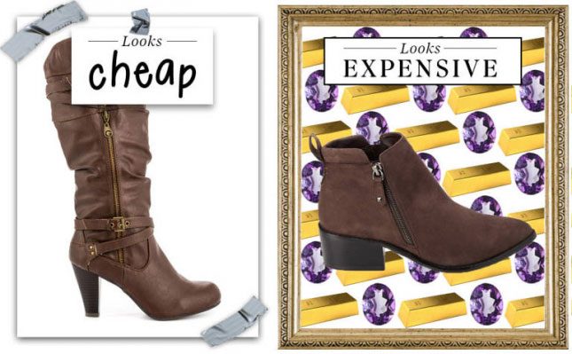 Найти материал, который точно повторяет текстуру натуральной кожи довольно сложно, особенно в коричневом цвете. Чтобы искусственная текстура была менее заметна, выбирайте короткие ботинки вместо сапог.