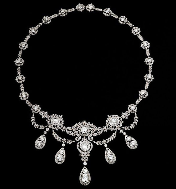 Колье с бриллиантами бывают тоненькими и широкими, могут содержать крупные бриллианты и мелкие, а ещё могут сочетаться с другими драгоценными камнями. Большое колье будет лучше смотреться в сочетании с платьем, имеющим декольте.