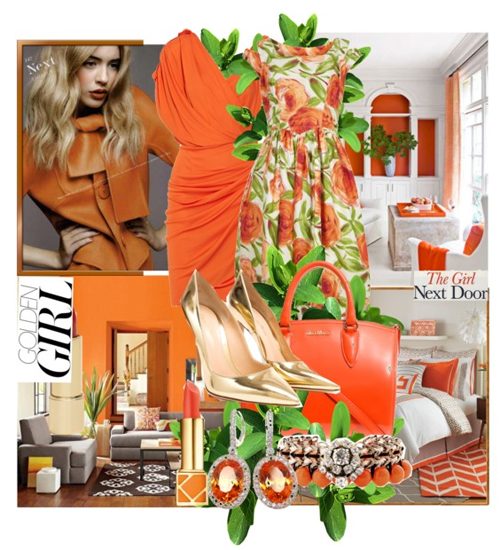 Собираясь на вечернее светское мероприятие, вы смело можете надеть к оранжевому платью золотистые туфли или/и взять золотистый клатч: золото – это металл желтого цвета, т.е., соседний в цветовом круге с оранжевым.