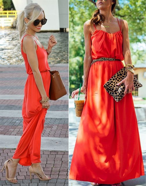 Выбирая аксессуары к оранжевому платью, остановите свой выбор опять-таки на бордовом цвете. Будет очень эффектно, см. фото: