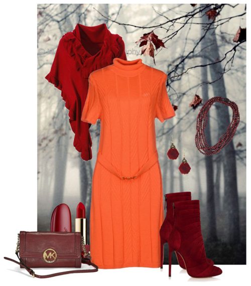 Очень стильно смотрится сочетание оранжевого платья (в данном случае морковного оттенка) с бордовым или терракотовым, поэтому, если вы собираетесь купить оранжевое платье, купите этого цвета если не обувь и сумку, то хотя бы шарф.
