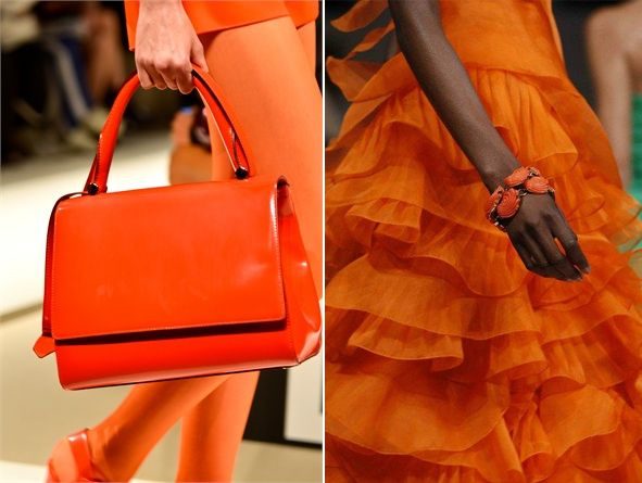 Очень эффектно сочетается оранжевый с цветом фуксии и малиновым. Если вы не найдете вечернего платья с таким сочетанием, по возможности купите сумку этого цвета.