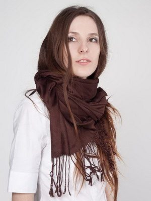 Из объемной, но очень тонкой модели с бахромой по краям можно сделать оригинальное украшение в виде розы. Накиньте аксессуар на плечи, оставив один конец длиннее другого. Длинный подверните несколько раз и соберите в аккуратный бутончик, закрепите его с помощью бахромы, перевязав у основания и, с помощью броши или булавки, прикрепите получившуюся «розу» к короткому свободному концу.